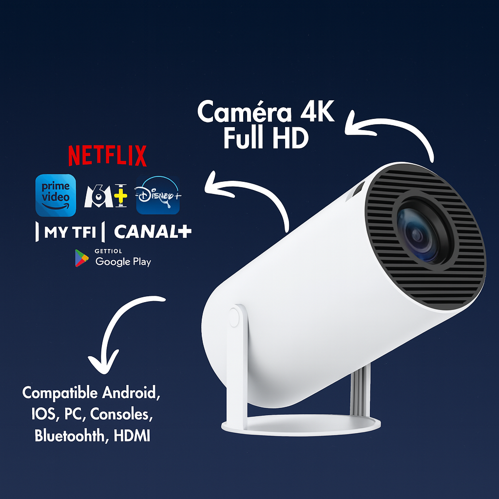 Découvrez le ProjiX™, projecteur home cinéma 4K avec haut-parleurs HiFi 85dB pour un son riche et immersif. Profitez du WiFi 6 et du Bluetooth 5.3 pour un streaming fluide sur Netflix, Prime Video, YouTube et plus encore. Grâce à la correction automatique de l’image, un réglage intelligent des couleurs et une rotation à 360°, ProjiX s’adapte à tous vos espaces. Avec un écran jusqu’à 150 pouces, il transforme vos soirées en véritables expériences cinéma. Ports HDMI et USB inclus pour connecter facilement vos consoles, box TV ou appareils mobiles.